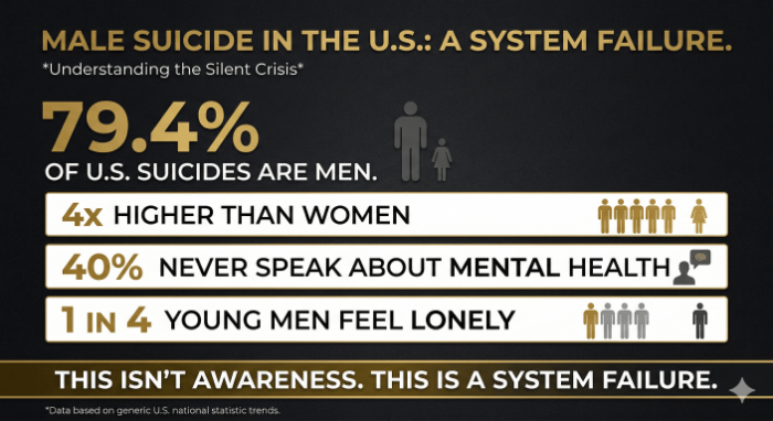 According to the Centers for Disease Control and Prevention (CDC), men account for 79.4% of all suicides in the United States. The male suicide rate remains nearly four times higher than that of women.